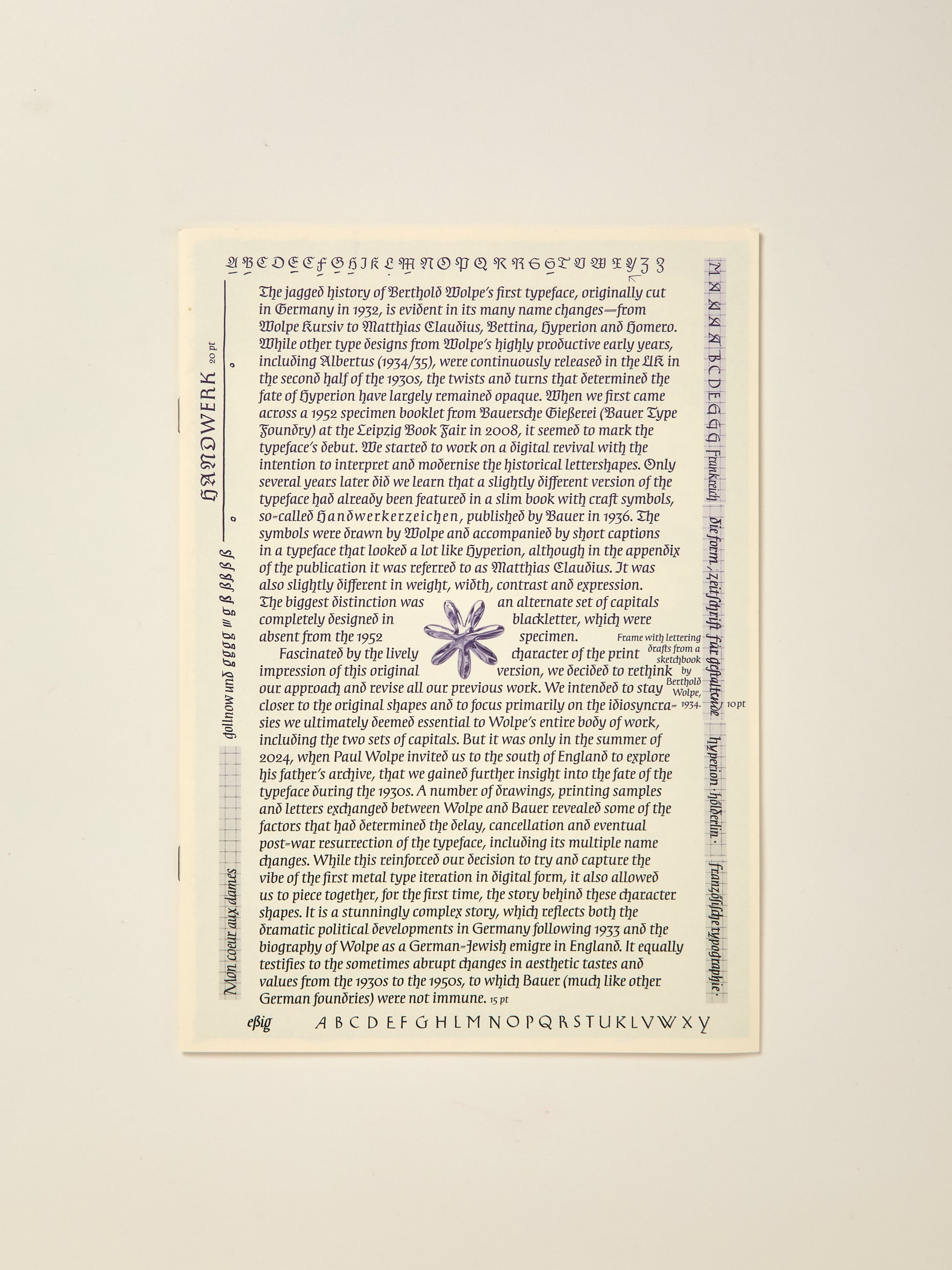 Handwerk revives Berthold Wolpe’s early type design, originally called Wolpe Kursiv and cut in metal by Paul Koch in 1932. It first appeared in a 1936 craft symbol book featuring unique blackletter capitals. Due to persecution as a Jewish designer under the Nazi regime, Wolpe’s work faced delays and alterations and was finally released in 1952 in a modified form. Handwerk captures the original hand-lettered feel and includes stylistic sets that reference both the 1952 release and the original blackletter capitals, providing a historical perspective on Wolpe’s type design.