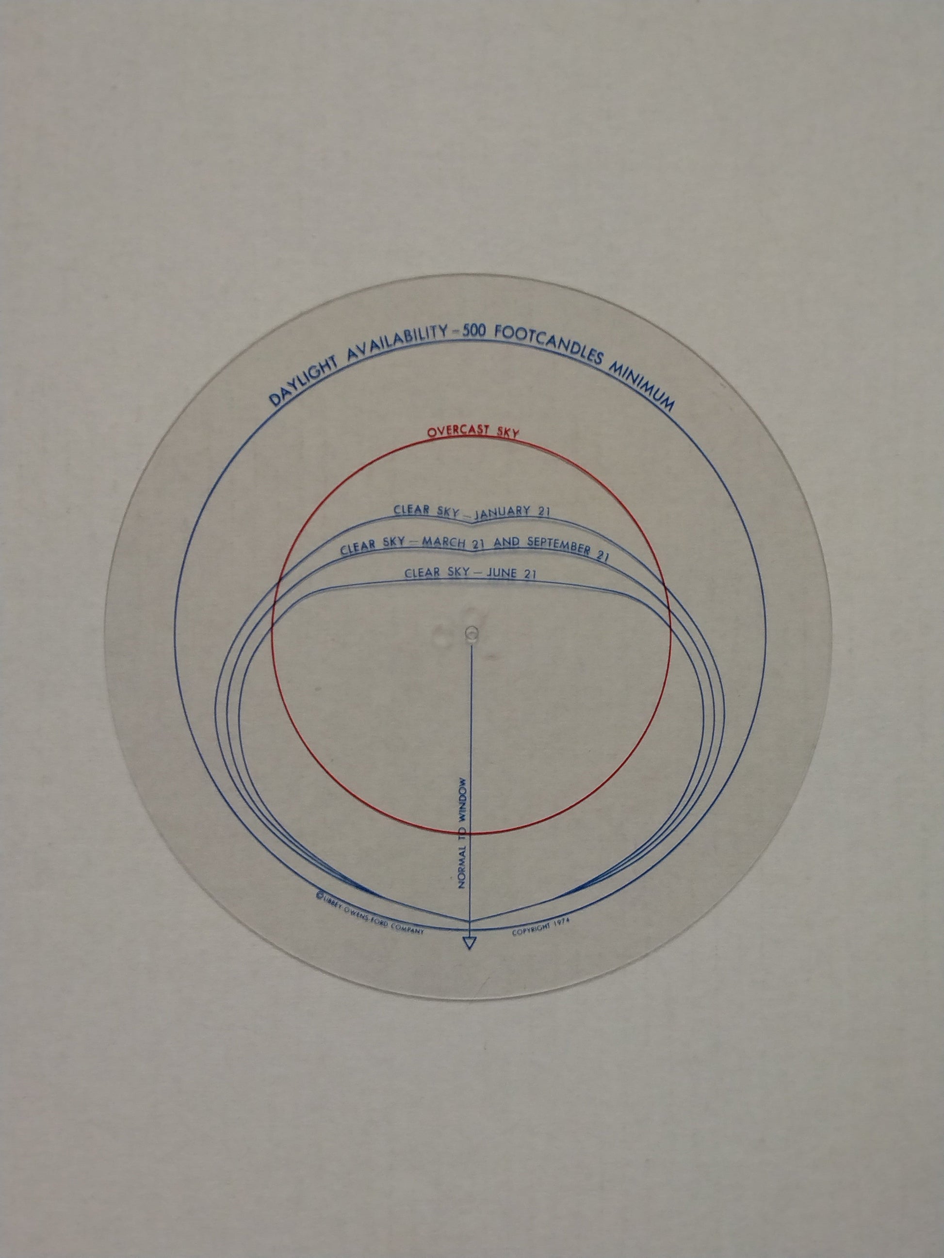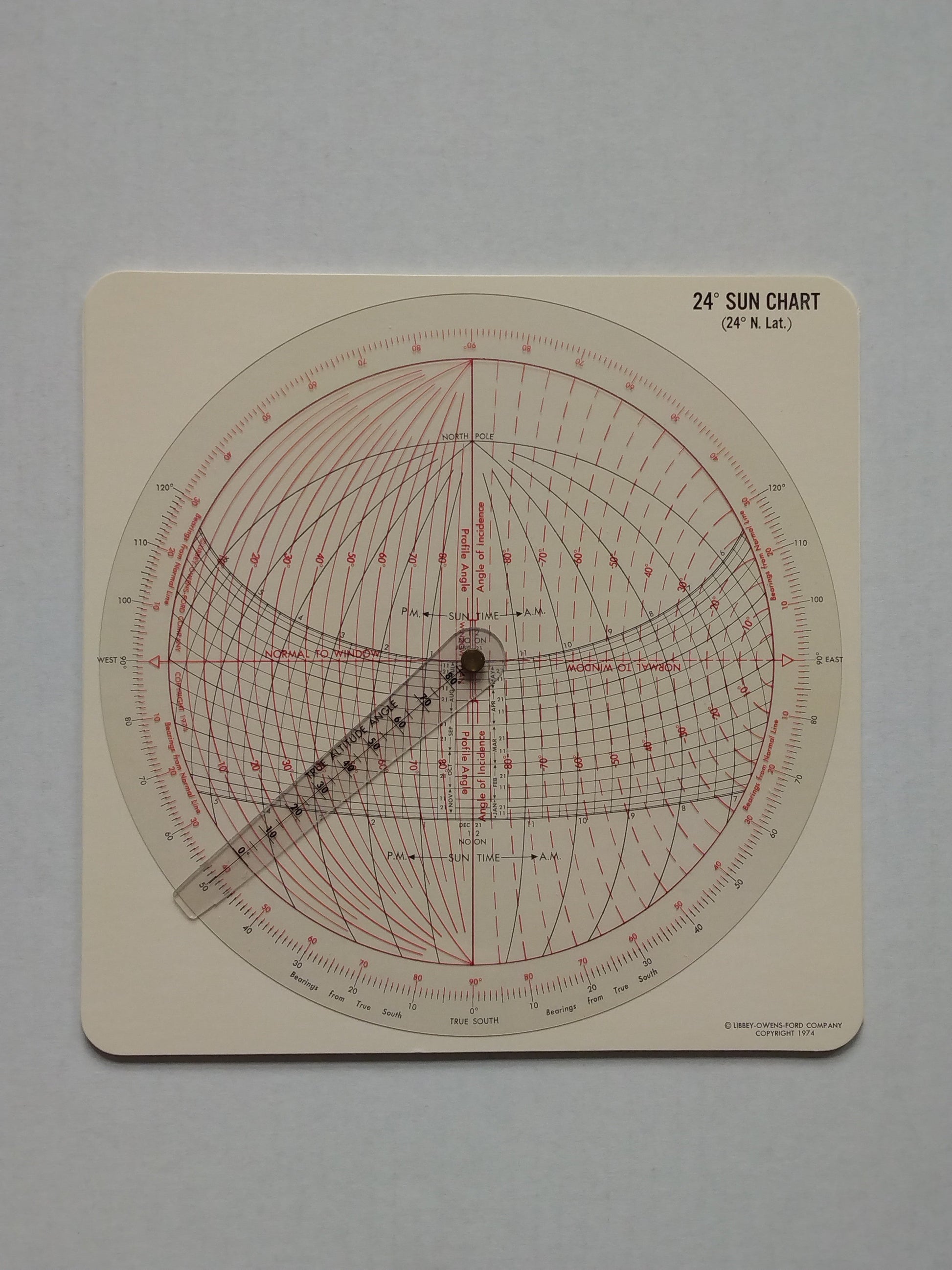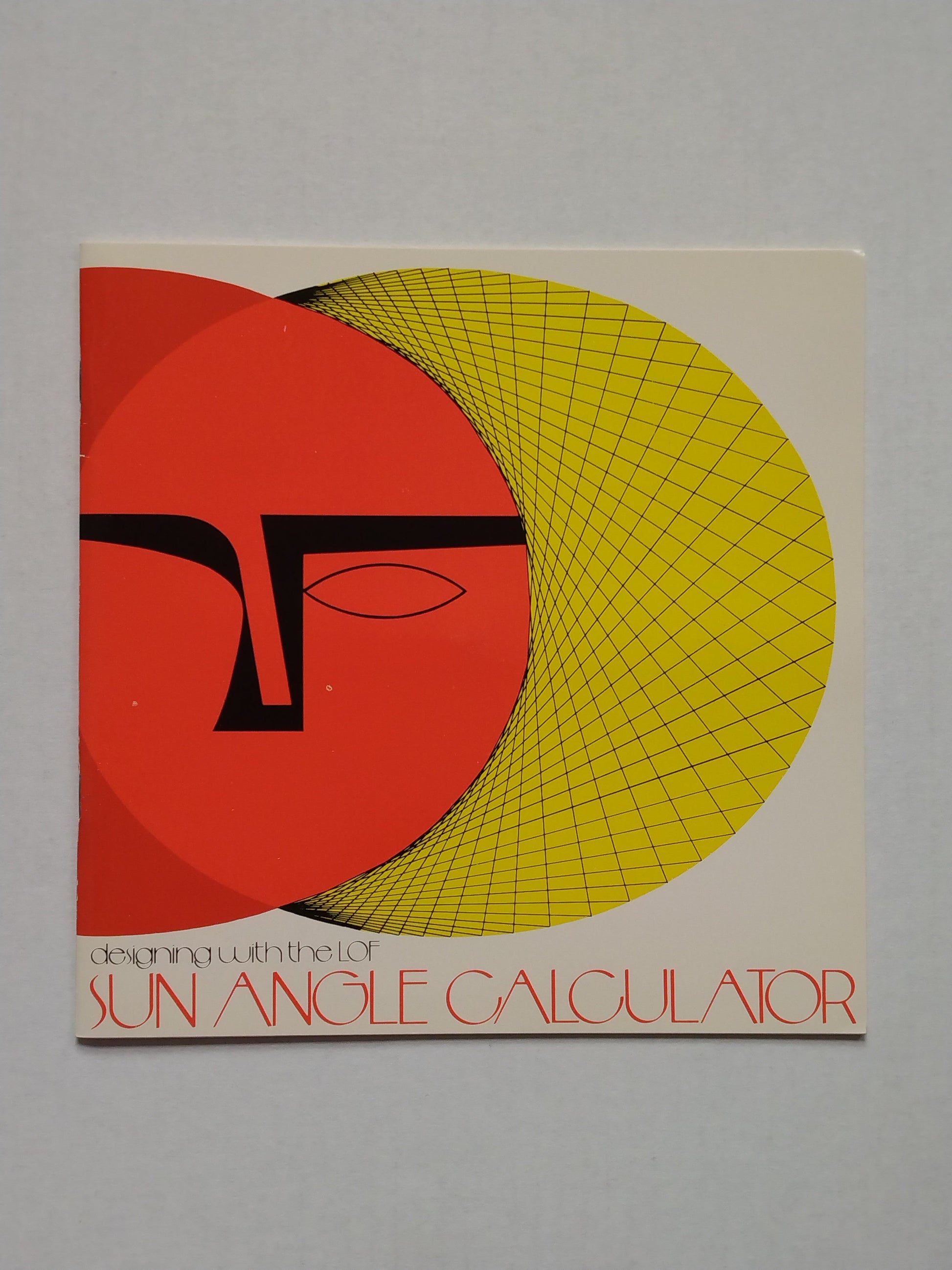 Sun Angle Calculator providing seasonal positional paths of the sun for use in determining Daylight and Shadow properties for planned sites, buildings, and architectural features, containing: Wrap-around Cover with charts (Use Instructions - Sun Chart - Magnetic Variation), Booklet 'Designing With The LOF Sun Angle Calculator', 4 double-sided B&W Sun Charts (Degrees: 24-28-32-36-40-44-48-52) with red transparent Sun Path overlay and cursor, and 1 Red&Blue transparent Daylight Availability overlay with envelope.